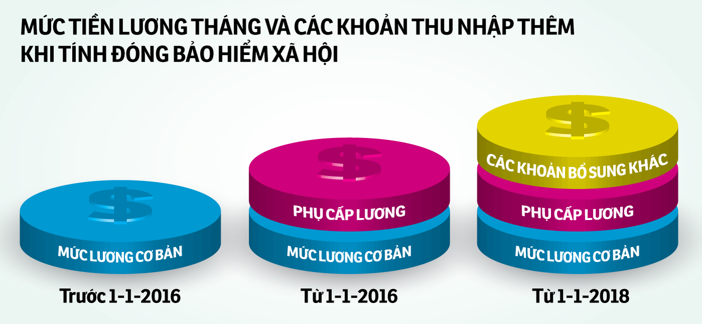 Từ ngày 01 tháng 01 năm 2018, tiền lương tháng đóng BHXH, BHYT, BHTN sẽ bao gồm mức lương, phụ cấp lương và các khoản bổ sung khác, cụ thể: